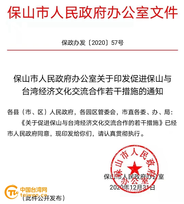 《保山市人民政府辦公室關於印發促進保山與台灣經濟文化交流合作若干措施的通知》。(圖片來源:雲南省保山市台辦供圖)